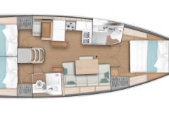 Center cleats, Additional water tank 200L (total 530L), Bowsprit, Additional control unit for electric anchor winch with chain counter, Indirect LED lighting, Roller blinds for windows in the saloon, Roller blind and sun screen for portholes in the saloon, Bottle storage under the floorboards, Gennaker equipment, Electric winch on the cabin roof on the port side, Winch on the cabin roof on the starboard side, Cockpit convertible into a sunbathing area with cockpit cushions, Audio player Fusion AR70N with Bluetooth, Bose speakers in the saloon, Subwoofer, Speakers in the cockpit, Outboard motor bracket, Fold-down wooden cockpit table, Air conditioning 230V (only with shore power), Additional bench seat in the saloon, Double berth in the saloon, Cockpit floor and bathing platform with teak, Delta anchor with 60m chain, Cockpit shower hot/cold