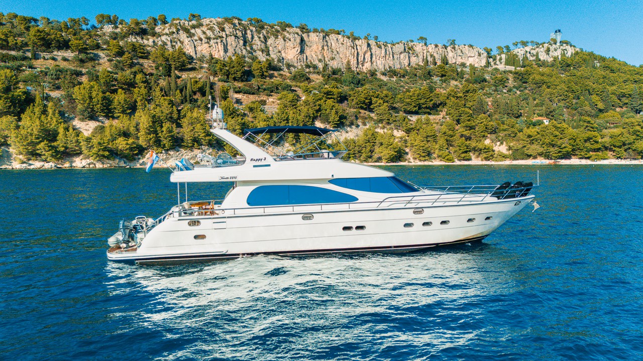 Presented by Amwax Prime, the astonishing charter yacht Happy3 is a 72 ft yacht. The main attractions of Happy3 are her most appealing features and interconnection with the sea. She was completed by the famous yacht builder Yaretti in 2004. The expansive yacht layout features 3 generous cabins and comfortably accommodates up to 9 guests.