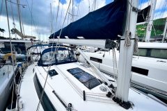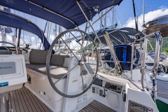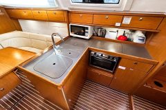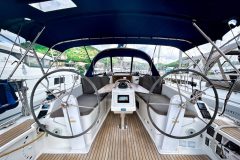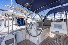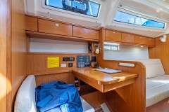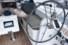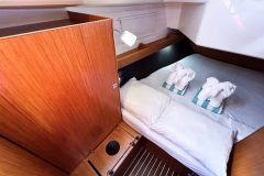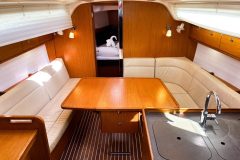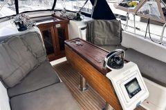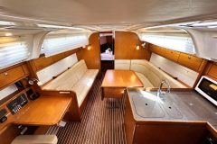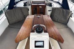 The twin helm setup and wide cockpit, comparable to larger 40-footers, allows for excellent visibility on either tack and provides a clear walk-through to the transom. Her drop-down swim platform transforms the stern into a spacious area to swim, board the dinghy, or simply relax by the water.
