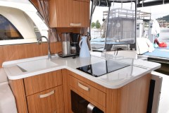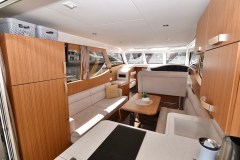 The yacht has a spacious living room with an open kitchen that links the interior with a back deck.