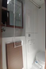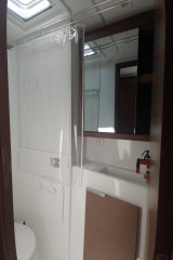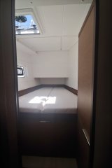 Bowsprit with integrated anchor roller made of stainless steel, Electric anchor winch 1000W with second anchor winch control and chain counter 12V, USB sockets in the cabins and salon, Indirect LED lighting, Indirect LED lighting of the cockpit floor, Wine storage cabinet under the floorboards, Blinds in the salon and in the cabins, Fly screen in the owner's cabin, Electric winch on the port side, Teak on the bathing platform and the cockpit benches, Hot water boiler 25L, Comfortable sofa lounge, Genoa sheet hauling point adjustable from the cockpit, Barrier-free access to the side decks, Center cleats, Stern shower hot/cold, Gas leak detector, Double berth in the salon, 160L refrigerator, Owner's cabin bed 2.00 x 1.50 m, Aft cabin bed 2.00 x 1.50 m