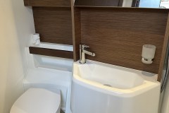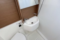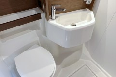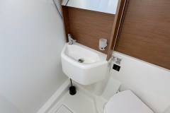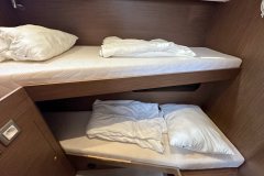 Stainless steel bow protection, transom protection, cockpit bench extensions, center cleats, cockpit table with stainless steel handrail - lighting and built-in 15 L cool box, outboard motor bracket, double berth in saloon, foot pump seawater/fresh water, 12 V refrigerator 130 L, refrigerator 85 liters with Opening from above, Mattresses in all cabins, Electric bathing platform with teak, Stern shower (hot/cold), Folding footrest for helmsman, Fans in all cabins and in the saloon, Indirect LED lighting, Additional water tanks (total 770 L), Hifi: Fusion + interior speakers & waterproof exterior speakers, fly screens in front of the windows, 2 genoa winches, polyester bow platform with anchor roller and water stay (for attaching the gennaker), German System (main sheet with folding runner at the helm), traveler rail for the genoa sheet, sun cushions for Companionway, opening window in the aft cabin, cockpit benches with teak, windlass control with counter operated from the cockpit, railing access, teak on sun loungers