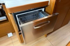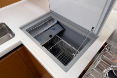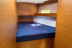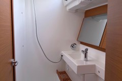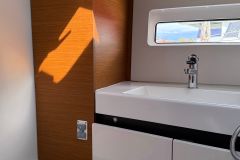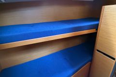 Loudspeakers in the cockpit and in the saloon, Fusion Player (radio/USB/Bluetooth) Blinds and fly screens, Cockpit shower (hot/cold), Skipper cabin with toilet, Cockpit bench convertible into a bed with cushions, Electric winches, 19L refrigerator opening from above, Additional refrigerator in the cockpit, Additional 75L refrigerator in the pantry, Wine refrigerator 230V, Indirect LED lighting, Hot water boiler 40L, Center cleats, Teak on the cockpit benches and on the electric bathing platform, Electric anchor winch 1000W 12V with chain drum - 10mm, Gas leak detector, Double berth in the saloon, Aft cabin bed 2.00 x 1.60 m, Forward cabin bed: 2.00 x 1.40/0.79 m