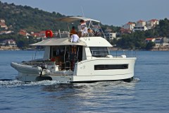 The power cat from the manufacturer Fountaine Pajot ‘Thunderball’ offers the perfect ambience to spend a relaxing holiday on a comfortable, spacious catamaran. 8 people (4 double cabins) can spend the night on the ‘Thunderball’. With 2x 200 hp, the ‘Thunderball’ is well motorised to cover long distances. Air conditioning, inverter and 3 fridges for well-chilled ‘manoeuvre drinks’ and fresh food are also on board. Electricity is produced in an environmentally friendly way via a solar panel. Our yachts are equipped with C.I.G.O. Charter Information Guide Online. Unlimited internet, dinghy and outboard motor are included in the charter price.