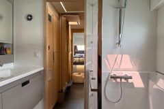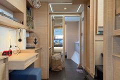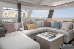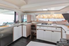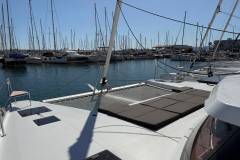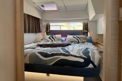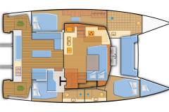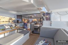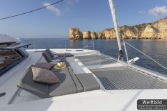 Skipper's cabin starboard, Stronger engine, Curtains in the cabins and in the saloon, CST HOOK mainsail battened, Electric mainsail winch, Electric genoa winch, Two bow seats, LED interior lighting, Cockpit lighting, 12V interior and waterproof 12V exterior sockets, BOSE player with Bluetooth, Inverter 2. 000 W, stern shower (warm), all-round panelling for cockpit (cake stand), bimini at helm position, all-round panelling for helm position bimini, Flexiteak on bathing platform - stern steps and cockpit, Flexiteak floor covering in shower, cushions for foredeck, Additional mooring cleats, Protective strips at stern of both hulls, Double berth in saloon, Slatted frames under all mattresses, Additional radio at helm position, Additional plotter at chart table, Additional 90 litre refrigerator, Refrigerator in cockpit, Air conditioning 52. 000BTU, 9KW generator, 220V50Hz, Bowsprit, Additional anchor windlass control panel with chain counter at helm position, Hydraulic bathing platform (max. 150kg), Water purifier 12V 105l/h, Gas barbecue at stern